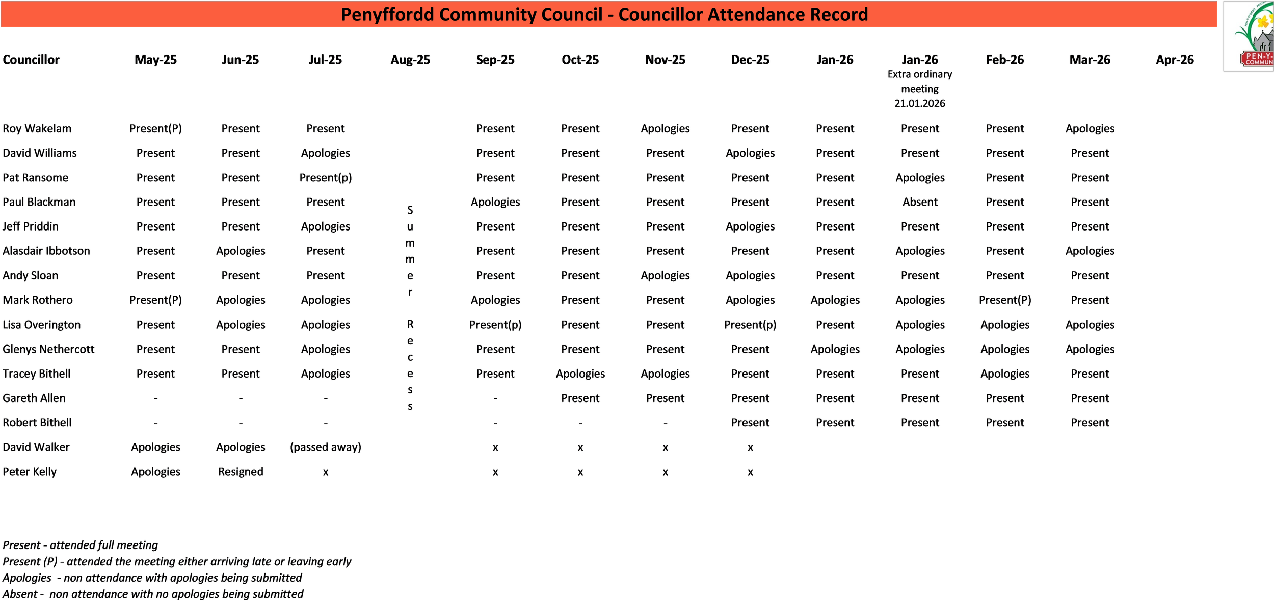 Meetings of the council are held on the 2nd Wednesday of each month, exc August which is summer recess and are held in the Penyffordd War Memorial Institute.